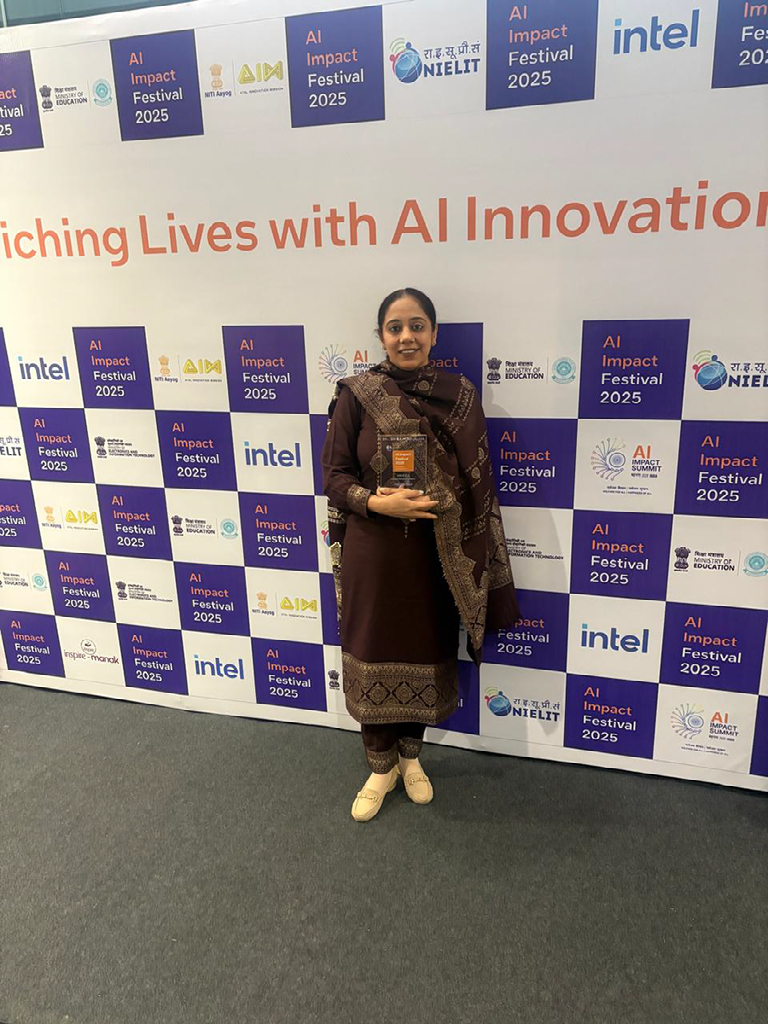 Ms. Tajinder received the prestigious Intel AI Shapers – Educators Category National Award 2025 at the Intel AI Impact Festival 2025, organized by CBSE, NITI Aayog (AIM), NIELIT, Ministry of Education and Intel India. The award recognizes her outstanding contribution to AI-enabled educational innovation, reinforcing the school’s commitment to future-ready skills and excellence.