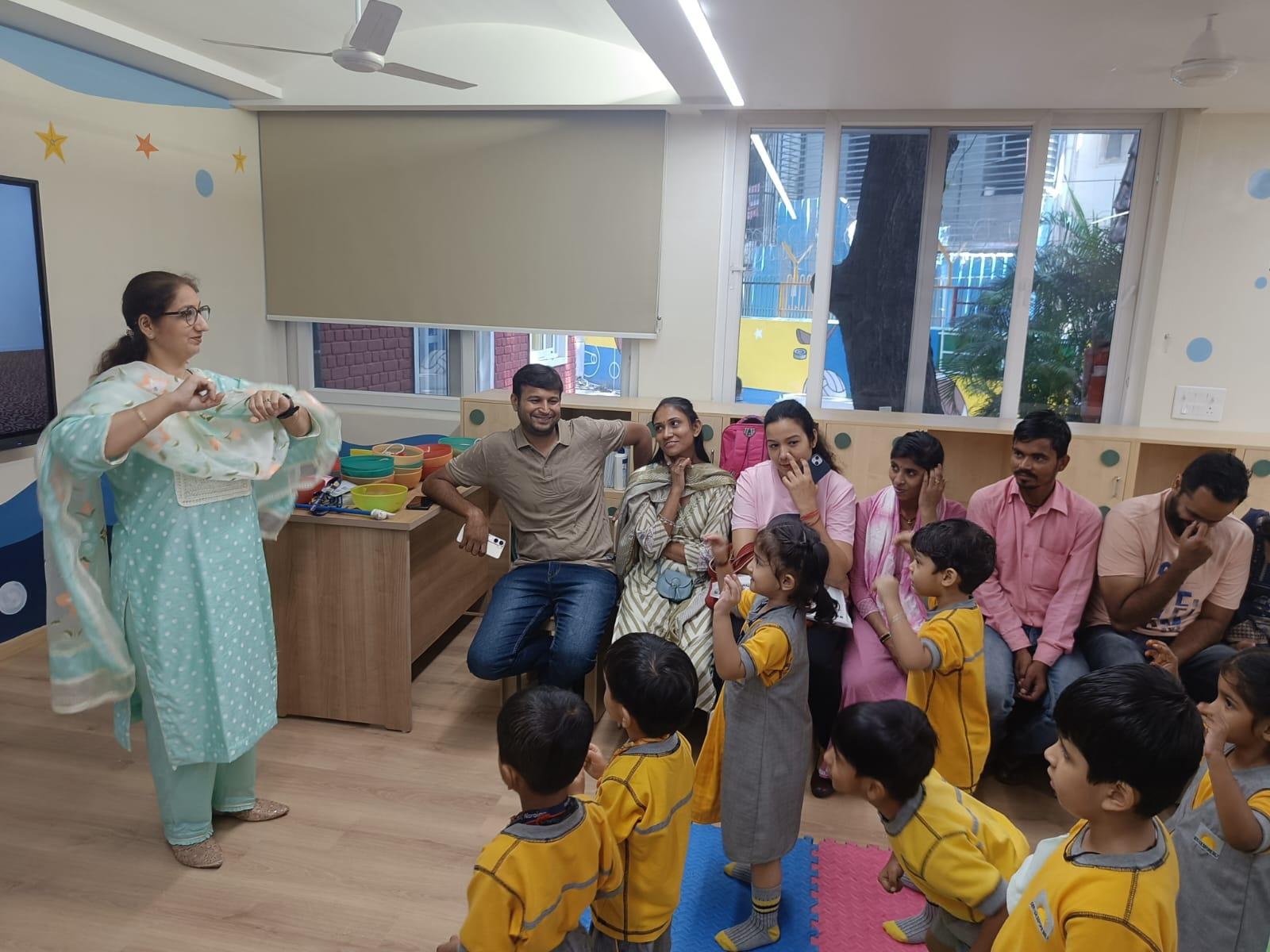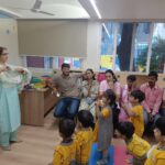 The children also confidently recited the Hindi rhyme “धोबी आया” showcasing their growing language abilities. The session concluded on a joyful note with the popular action song “If You Are Happy and You Know It,” filling the classroom with laughter and applause.