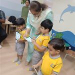 The program began with a heartfelt prayer followed by a cheerful good morning song, creating a lively and positive atmosphere. The children then enthusiastically participated in various activities designed to support their early development. They learned about body parts , followed by an action rhyme “Head, Shoulders, Knees and Toes,” which helped them recall the names of body parts in a fun and engaging way. In the hygiene tools activity, children explored items placed in cups and discussed their uses. This was reinforced by the rhyme “Brush Brush Brush Your Teeth,” encouraging good hygiene habits.