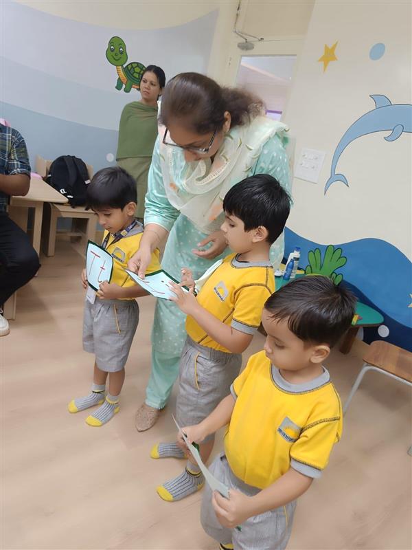 Next, during the LTI (Learning Through Interaction) session, letters were written on the board and each child took turns identifying and speaking the letter, it’s phonic sound and vocabulary words aloud, building their vocabulary and confidence. The energy continued with the delightful Chick Dance, where children imitated chick movements with joy and excitement. Practical life skills were also emphasized through hands-on activities such as beading, buttoning, and zipping, which support fine motor development and independence.